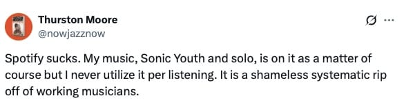I’m all for artists taking control of their work. I think it’s fantastic that Deerhoof, King Gizzard, and others are choosing to pull their music from Spotify. If a club takes too much of a percentage from a band’s merch stand, the band shouldn’t sell merch there. That’s better than telling kids it would be cooler to buy this t-shirt direct from the band's website, but if they gotta be dicks and get it at the show, fine. You go on strike if a workplace is unfair. You refuse to work for monsters. You don’t clock in, put on the uniform, then tell people they suck for shopping there while tapping the tip jar. How can it be worse to be a consumer of Big Industry than a profit partner? If Spotify is siphoning royalties on tracks with low streaming rates, why would you provide them?