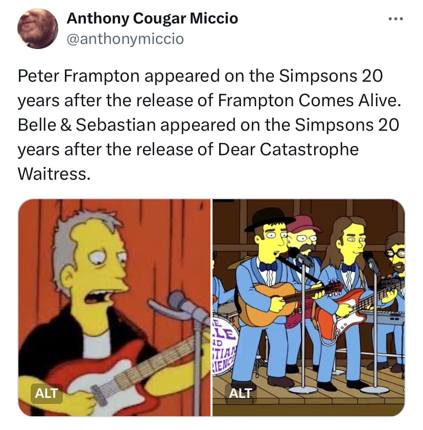 Peter Frampton. His lack of a single studio album - or even studio single - with any cultural significance is a major sticking point. Plus, when he played in the band at the Grammy’s televised celebration of the Beatles, they didn’t even acknowledge the guy on air. And he starred in a movie of Beatles songs! With The Bee Gees! But his live album has a lot of cultural significance, enough to get him memorable name-checks on Three’s Company, Wayne’s World and The Simpsons. So whether he’s remembered for being a poster boy or a punchline, his name is pretty remembered.