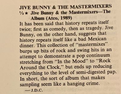 I had Jive Bunny & The Mastermixers' The Album in elementary school, presumably out of a fascination with music history and sampling techniques. "Swing The Mood" quite the novelty single! Why anyone with a working knowledge of music history and sampling techniques would enjoy it though, is a fair question. Many did not.