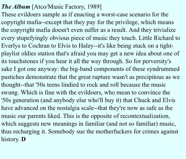 I've always admired Christgau bothering to elaborate beyond a simple, valid "fuck that noise." As a prepubescent kid trying to break my parent's least essential, most ignored records in time to "Simply Irresistible," the distinction between swing and rock & roll was lost on me (Bob didn't appreciate the historical implications of the Dirty Dancing Soundtrack, either). With every passing year, the ingredients of "Swing The Mood" - the subtly maladjusted lagomorph's breakthrough hit - fascinate me even more in their slapdash indifference to anything but a mindless, cheery concept of "old school" that fellow squares could presumably conceive Meghan Trainor to.
