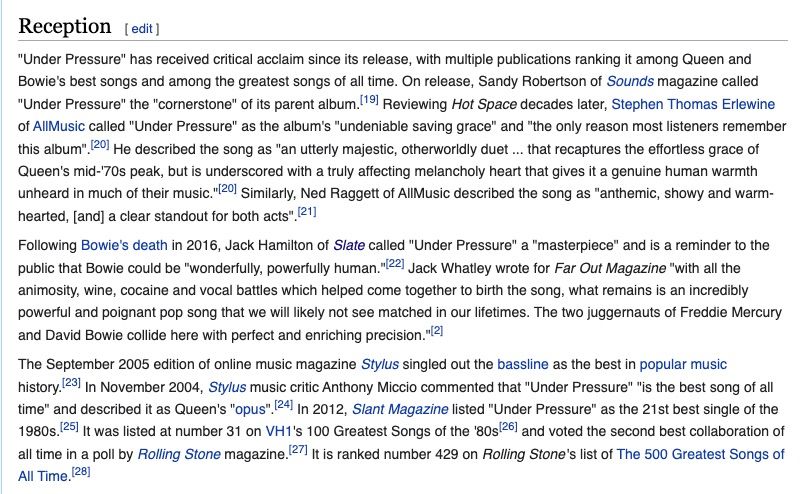 Hawkins is thankfully still showing off the pipes as well, singing “Under Pressure” with Queen (Roger Taylor standing in for David Bowie as he always did at Queen concerts) and “Back In Black” with AC/DC’s Brian Johnston at the Wembley Taylor Hawkins memorial concert this month. Wikipedia still tells people I think that “Under Pressure” is the best song of all time (still true!) so you best believe I have a strong opinions about attempts to cover it. And my strongest opinion concerns the second verse. David Bowie, likely aware he was collaborating with the most globally appealing rock band in music history, truly brought his A-game to the lyric. It’s a gorgeous, heartbreaking rumination on the necessity of love in the face of a soul-crushing world. It’s like watching a birthing video of the Stockdale paradox when Mercury asks why love is hard and Bowie actually explains why before they agree we’ve got to go for it anyway. Mercury and company had more to do with the music's operatic build-up than the words, which might be why…when Bowie steps back and Freddie Mercury steps up after the first chorus…Freddie goes “…day day de mm hm…da da da ba ba…okay…”