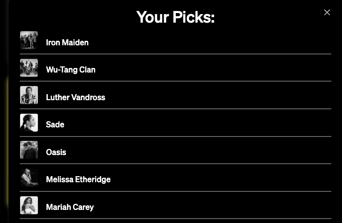 Sade: Treated as a supernatural icon of island-spa sexuality since before many of these groups started. I even had her ahead of Oasis in 2024, noting the effort people take to pronounce her name correctly, and the esteem she gets for music usually associated with Skinemax.